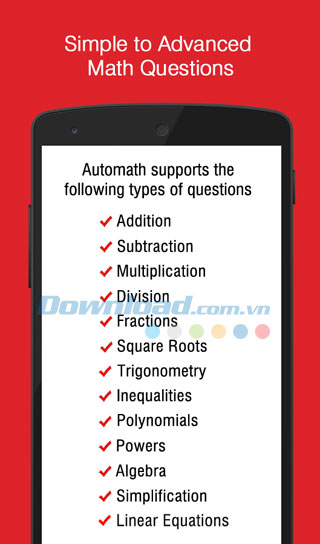 Ứng dụng giải toán đại số bằng camera điện thoại Automath cho phép bạn giải quyết những câu hỏi toàn học đơn giản bằng các chụp lại phương trình đó từ ứng dụng, và việc còn lại “cứ để Automath lo”. Ứng dụng này lý tưởng để bạn kiểm tra lại đáp án, tìm lời giải, hỗ trợ học toán và thậm chí bạn có thể tự học bằng ứng dụng này.
